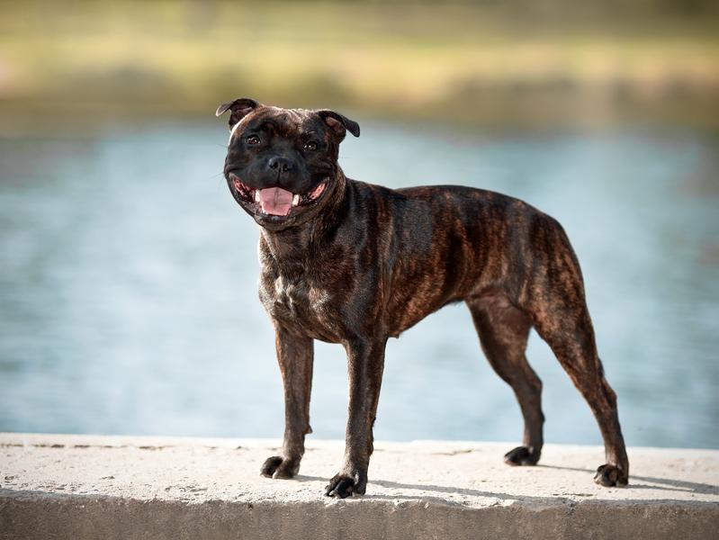 El staffordshire es un perro de talla media, pelo corto y muy musculoso. Aunque es un perro robusto y de gran fuerza para su talla, también es un perro ágil y activo. La cabeza corta y ancha de este perro puede inspirar temor a quienes no lo conocen o, cuando menos, mucho respeto. Los músculos masticadores están muy desarrollados, siendo evidentes en las abultadas mejillas que presenta el staffordshire bull terrier. La nariz debe ser negra en todos los ejemplares de la raza.