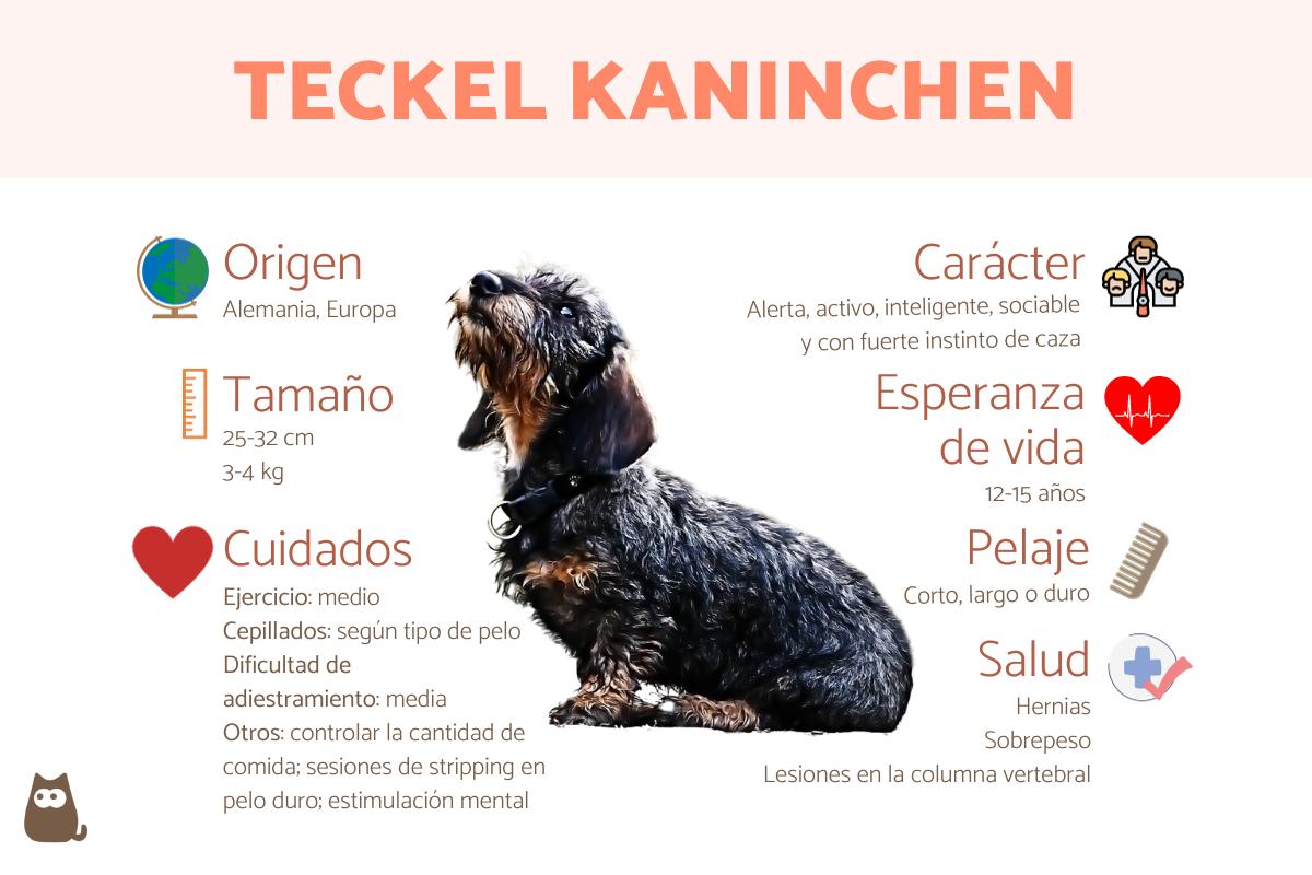 El teckel es una raza canina muy conocida y popular desde hace muchos años. Su pequeño tamaño, su aspecto simpático y su carácter vivaz lo han convertido en un excelente compañero para el hogar, más allá de sus aptitudes como perro de caza, que era su función originaria. Pero no hay un único teckel, sino que el estándar reconoce tres tipos diferenciados según su tamaño. Son el teckel estándar, el miniatura y el kaninchen, que también se conoce como teckel conejo o para la caza del conejo. Precisamente, sobre las características del teckel kaninchen hablaremos en el siguiente artículo de ExpertoAnimal.