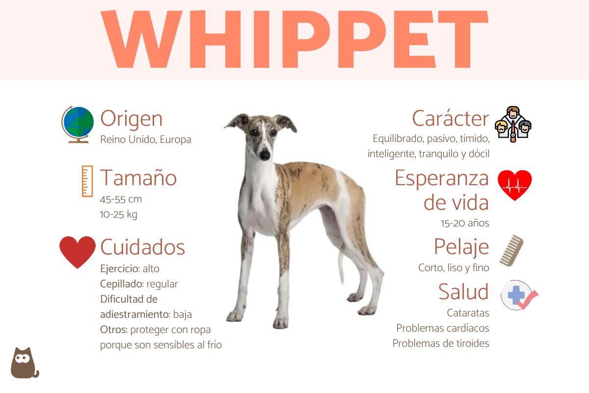 Si estás pensando en adoptar un whippet y tienes dudas acerca de su tamaño o peso, has entrado en el sitio adecuado. En esta ficha de raza de ExpertoAnimal detallaremos contigo todo lo que debes saber sobre el perro whippet, sus características, origen y cuidados, entre otras muchas cosas. ¡No te lo pierdas!