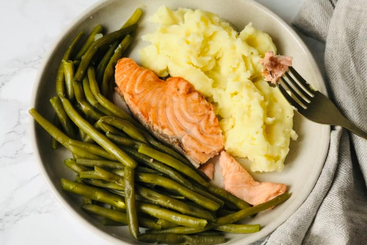 Para preparar el puré hervimos las patatas, las escurrimos, añadimos muy poco aceite y trituramos. La mejor forma de preparar el salmón es el lomo en filete (sin espinas), lo cocinaremos al vapor o lo hornearemos al papillote para que se cocine en su propio jugo.