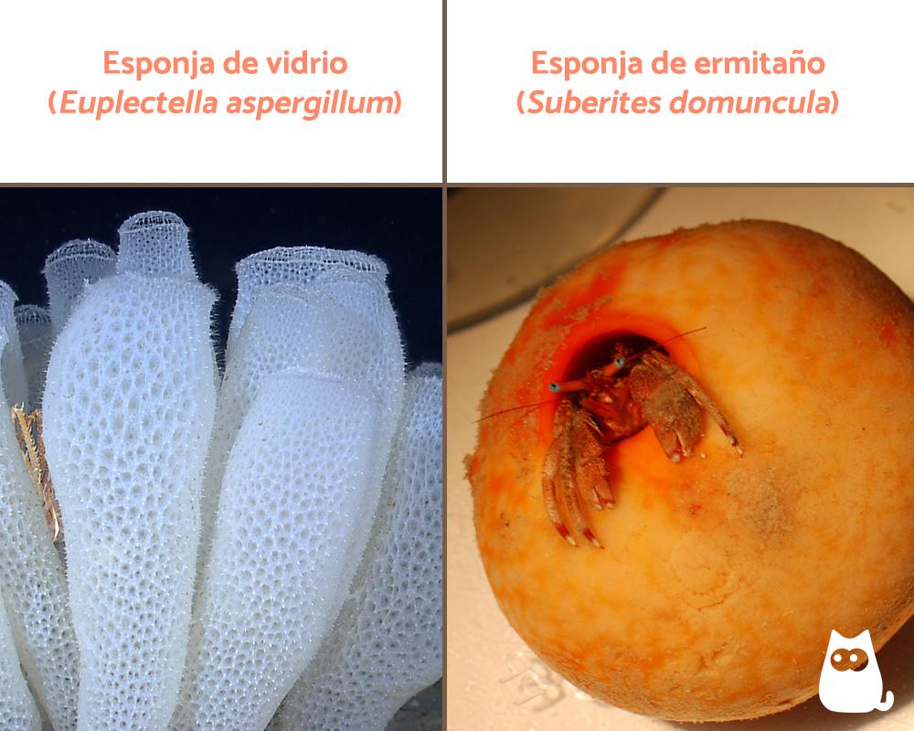 - Esponja de vidrio (Euplectella aspergillum): alberga a una pareja de crustáceos del género Spongicola que quedan atrapados en ella.