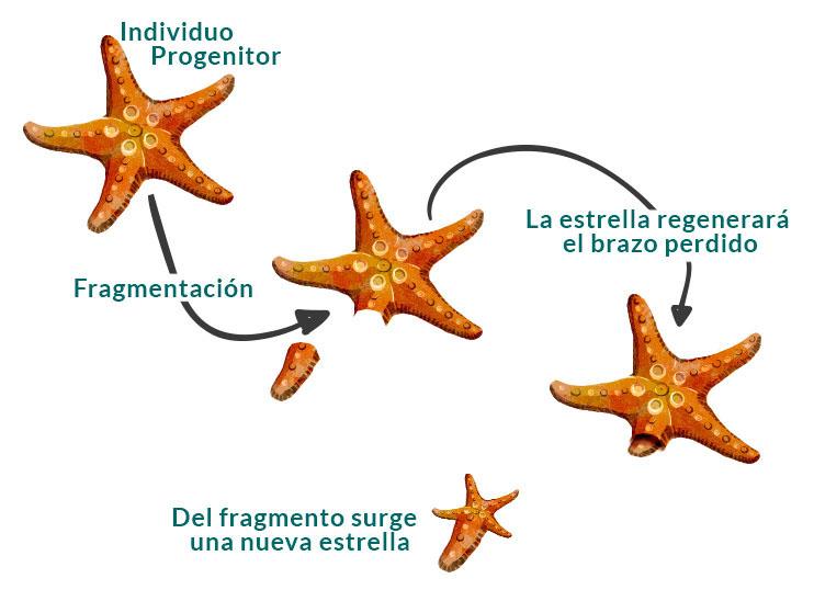 Algunos animales pueden reproducirse por fragmentación. En este tipo de reproducción, un animal puede partirse en uno o varios trozos y, de cada uno de esos pedazos se desarrolla un nuevo individuo completo. El ejemplo más típico podemos observarlo en el ciclo de vida de la estrella de mar, pues cuando pierden un brazo, además de poder regenerarlo, de este brazo se forma otro individuo, clon de la estrella original.