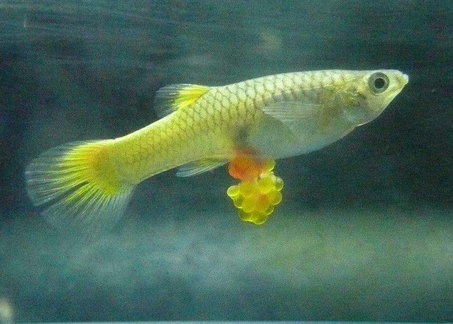 Además, muchas hembras pierden el apetito y se muestran nerviosas e inquietas; también es común que se froten contra los objetos del acuario, como las plantas y el cristal mismo del tanque.