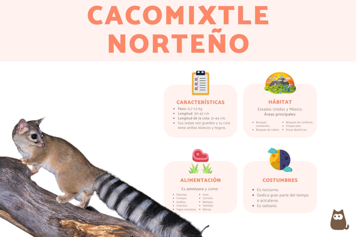 En esta ficha de ExpertoAnimal, te presentamos información sobre el cacomixtle norteño (Bassariscus astutus), conocido también como rintel o gato de cola anillada, aunque no es un tipo de gato salvaje. Es un mamífero que pertenece al orden de los carnívoros, aunque, como veremos más adelante, su dieta no es estrictamente a base de otros animales. Se ubica en la familia de los prociónidos, la cual comparte con otras especies, como los mapaches, que son sus parientes cercanos. Este es un curioso animal porque tiene una mezcla de rasgos entre un gato, un mapache y un zorro, lo que sin duda lo hace particular. Te invitamos a que sigas leyendo y conozcas todas las características del cacomixtle norteño.