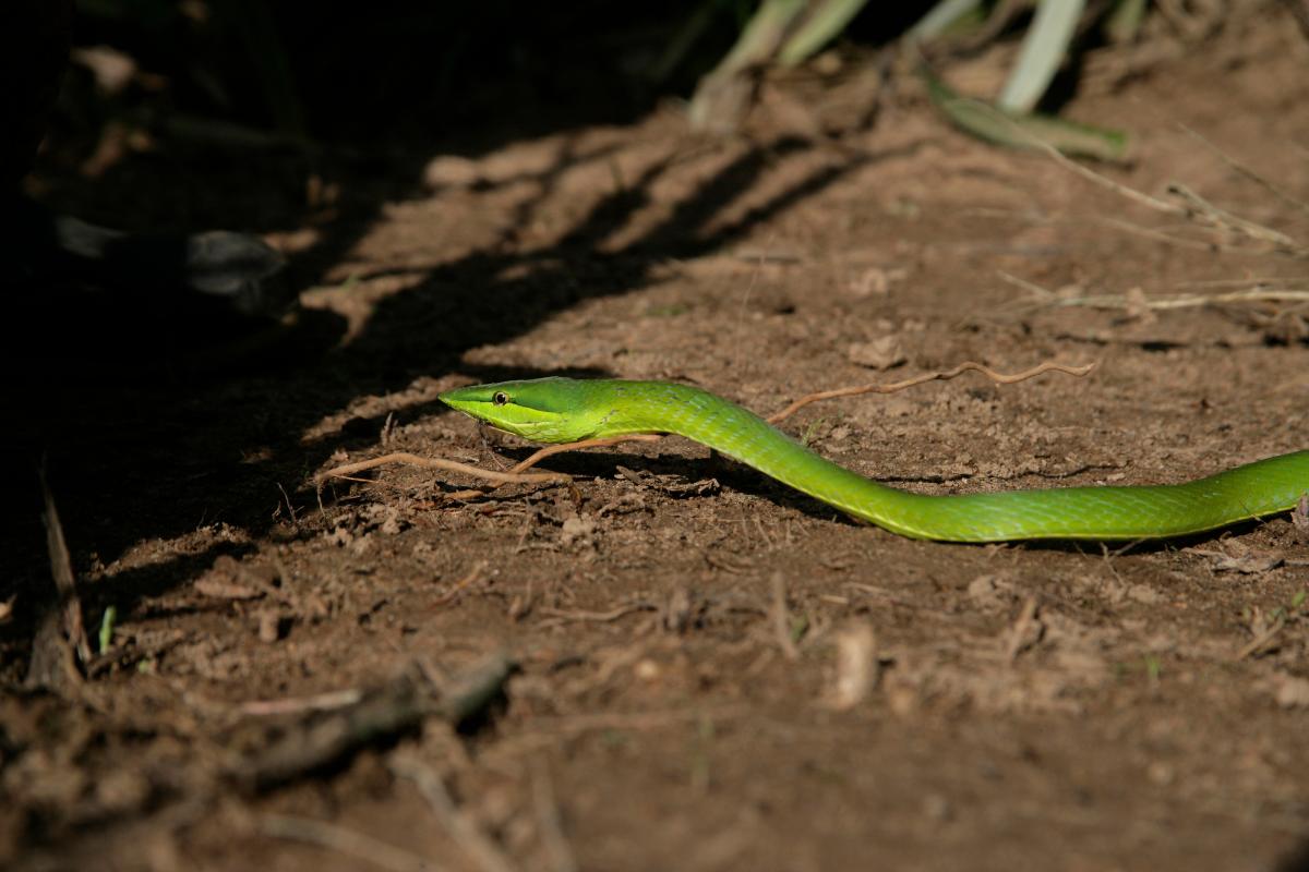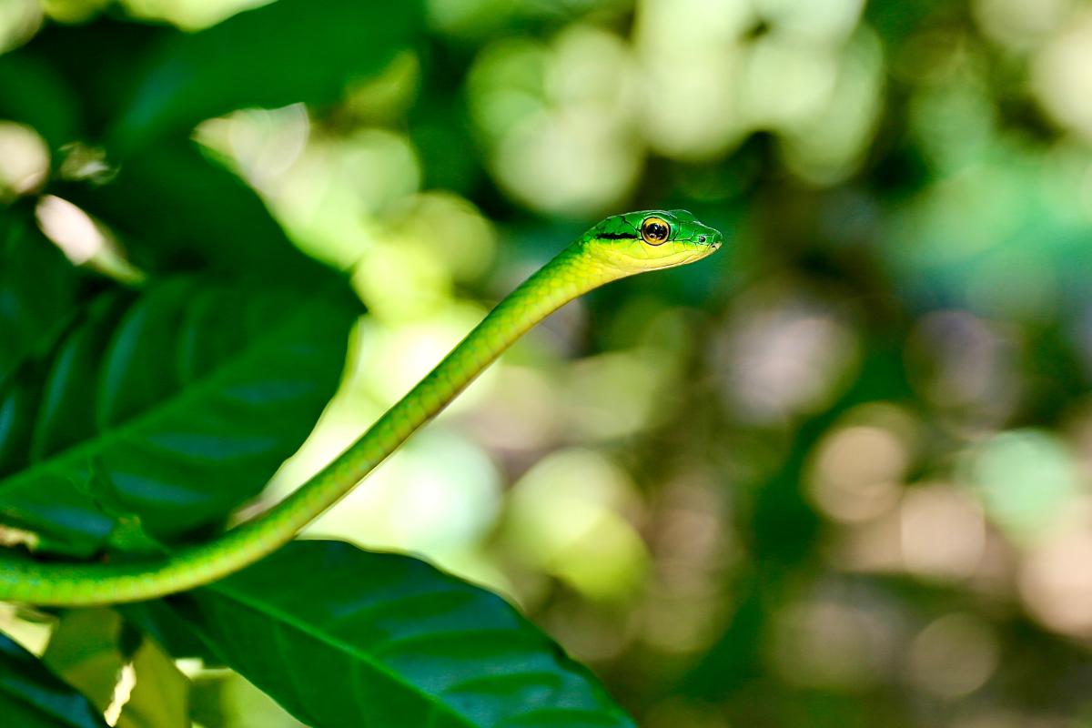 La bejuquilla verde, conocida también como culebrilla verde, es una serpiente no venenosa de Costa Rica, que se encuentra también en otras zonas de América Central y parte de Sudamérica. Esta especie es fácilmente reconocible por su cuerpo delgado y ágil, que puede alcanzar longitudes de entre 1,2 y 2 metros. Su coloración es predominantemente verde brillante, que le ayuda a camuflarse entre las hojas y ramas de los árboles donde pasa la mayor parte de su vida.