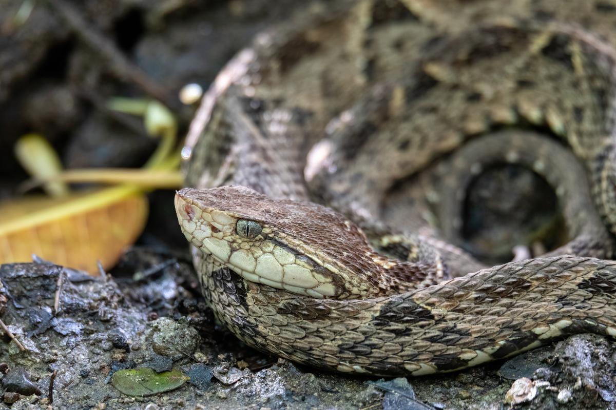 Bothrops asper, conocida como terciopelo, es una de las serpientes más peligrosas de Costa Rica y América Central. Es una especie de tamaño grande, alcanza hasta 2.5 metros de longitud, y tiene un cuerpo robusto con una coloración que va del marrón oscuro al gris, con patrones en forma de diamante que la ayudan a camuflarse en su entorno. Habita principalmente en zonas bajas y húmedas, como selvas tropicales y áreas cercanas a cuerpos de agua, siendo tanto terrestre como semiarborícola.