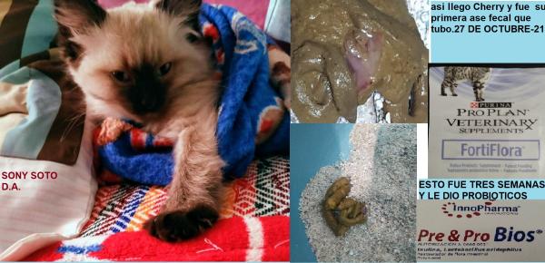 Pregunto me regalaron un gatito siamés de casi dos meses de edad pero llego con una infección intestinal lo lleve al veterinario lo vacuno y después se desparasito. El problema fue que comió croquetas de mis gatos y los contagio, sus ases fecales son aguadas y no son como antes, y el bebe gato hacia con poca sangre su excremento mucosidad blanca. También tiene pocos gases estomacales y le crujen los intestinos. Se llevo sus ases a laboratorio y el resultado es Técnica microscópica de flotación NEGATIVO a la presencia de estructuras parasitaria. Se observaron bacterias en forma de bacilos en cantidad abundante. el veterinario le dio sobres de lactobacilos sin mejoría. Mi dos gatos grandes una de 15 años de edad y el otro de 10 años contagiados del gato bebe, jamás se enfermaron y ahora no se que hacer me puede orientar que debo de hacer. El gatito no deja de comer pero quiere comer comida de uno y no le doy. Sus croquetas son Perfect Sense y Nuped probióticos. gracias