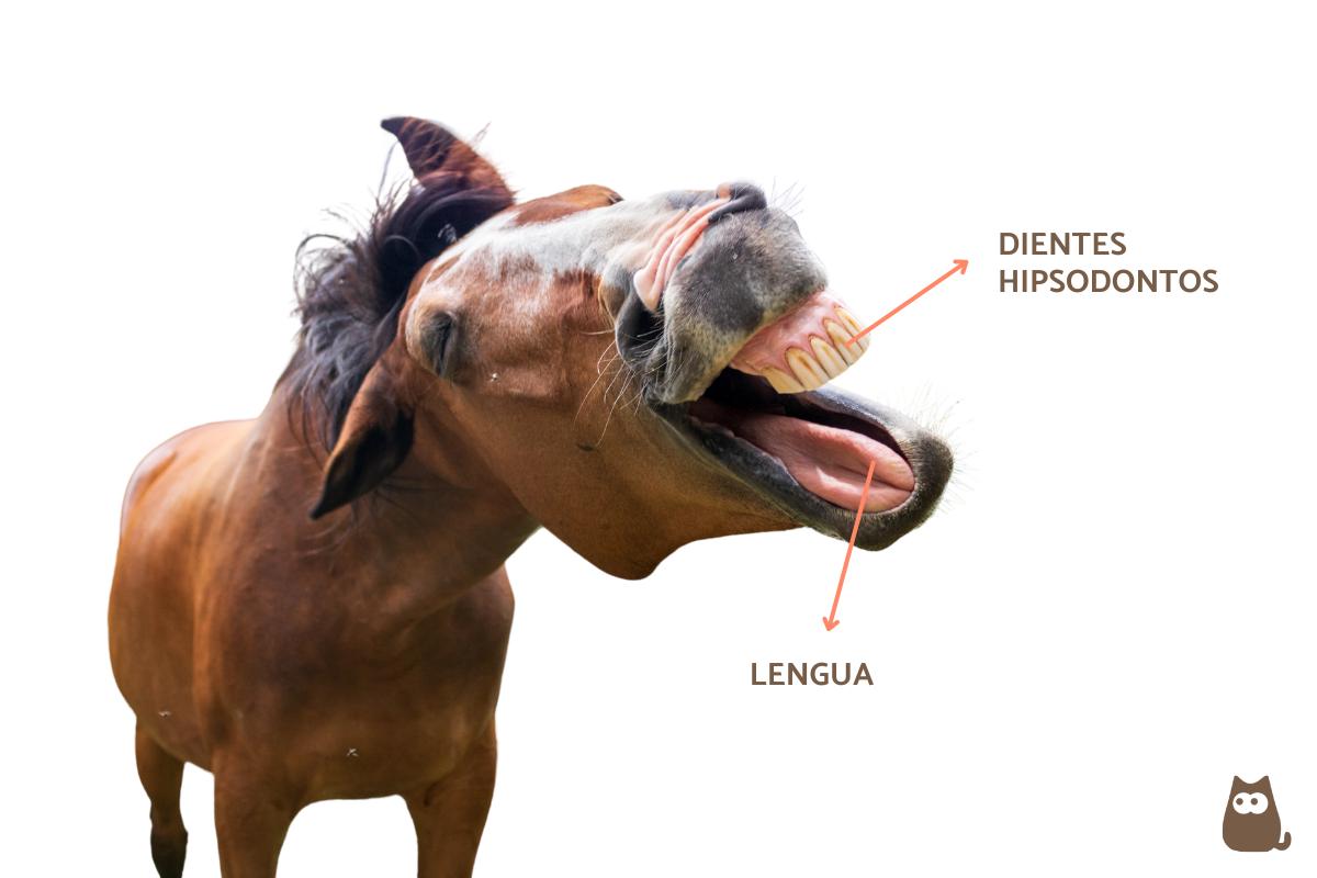 - Dientes: los caballos tienen dientes hipsodontos, es decir, que poseen coronas dentales elevadas, y son característicos de animales que consumen grandes cantidades de fibra vegetal. Al poseer coronas elevadas, se compensa el desgaste causado por el tipo de alimentación. Además, este tipo de dientes continúan creciendo a lo largo de la vida del animal. Los dientes desempeñan un papel crucial en la masticación y trituración del alimento, facilitando así la digestión de la fibra vegetal.