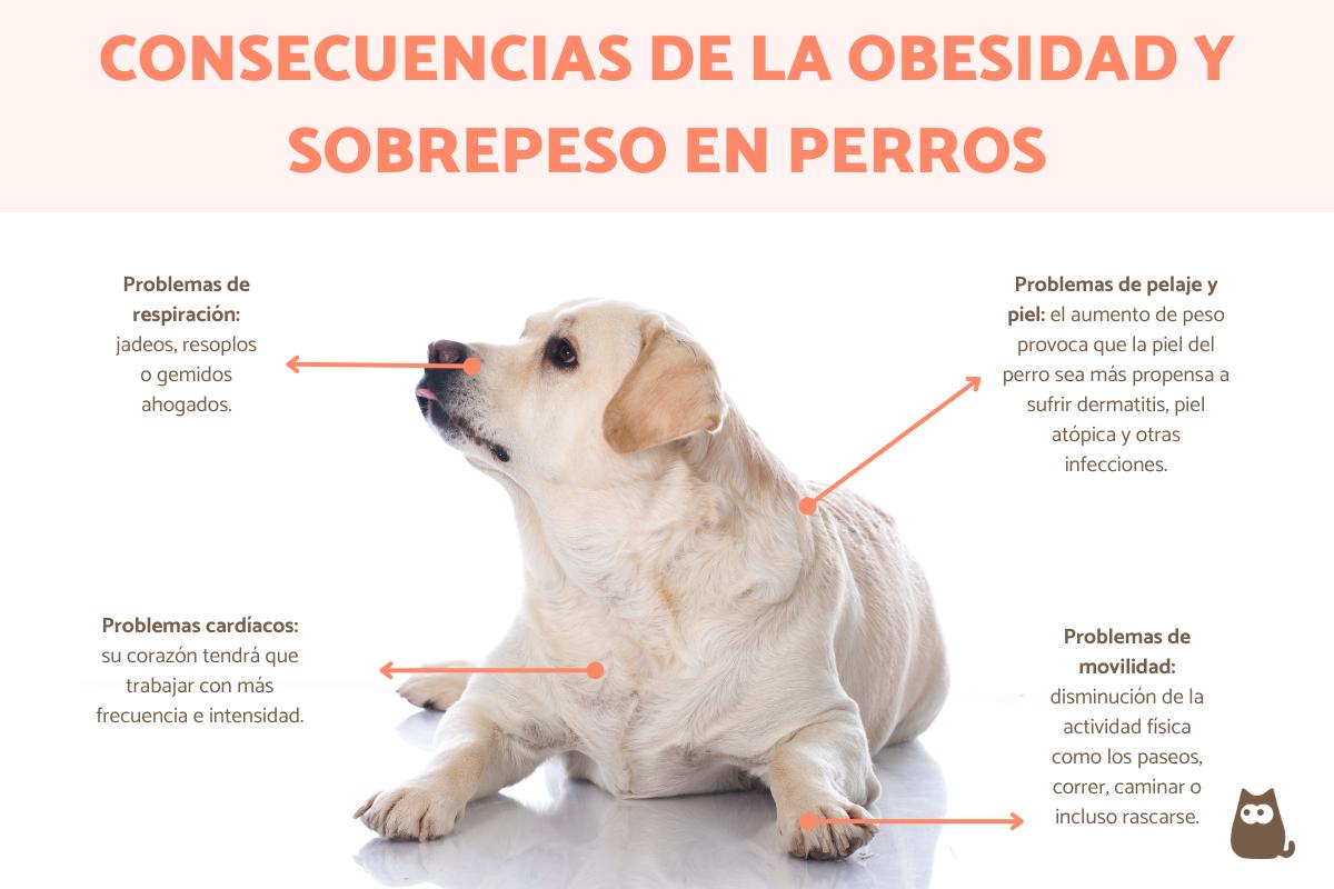 Los perros obesos de forma general acortan su esperanza de vida media entre 1 y 2 años, además de tener mayor probabilidad de morir de forma súbita. Por otro lado, el tejido adiposo puede tener efecto a nivel metabólico, ya que secreta sustancias proinflamatorias y hormonas, además de tener efectos mecánicos al aumentar el peso corporal. Algunos de ellos son problemas cardiovasculares y un mayor estrés para huesos y articulaciones.