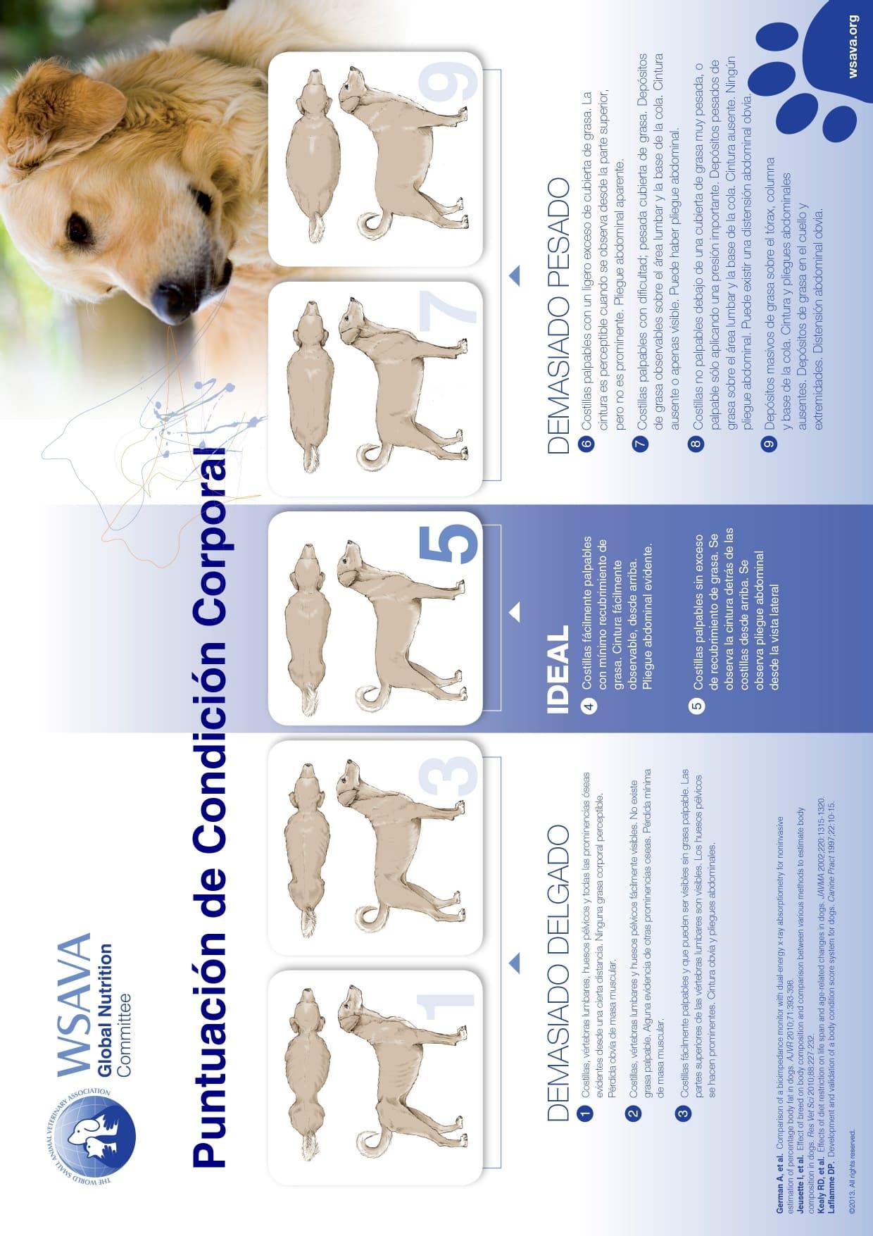 Para estimar el grado de obesidad en perros se utiliza de forma rutinaria, la tabla denominada body condition score, realizada por la Comunidad Global de Veterinarios (SWAVA). Consiste en adjudicar una puntuación del 1 al 9 a nuestro perro en función de determinados parámetros: si se observan las costillas, si se pueden palpar, cuál es la musculatura pectoral, cuál es la proporción de grasa abdominal y cómo es la musculatura en general.