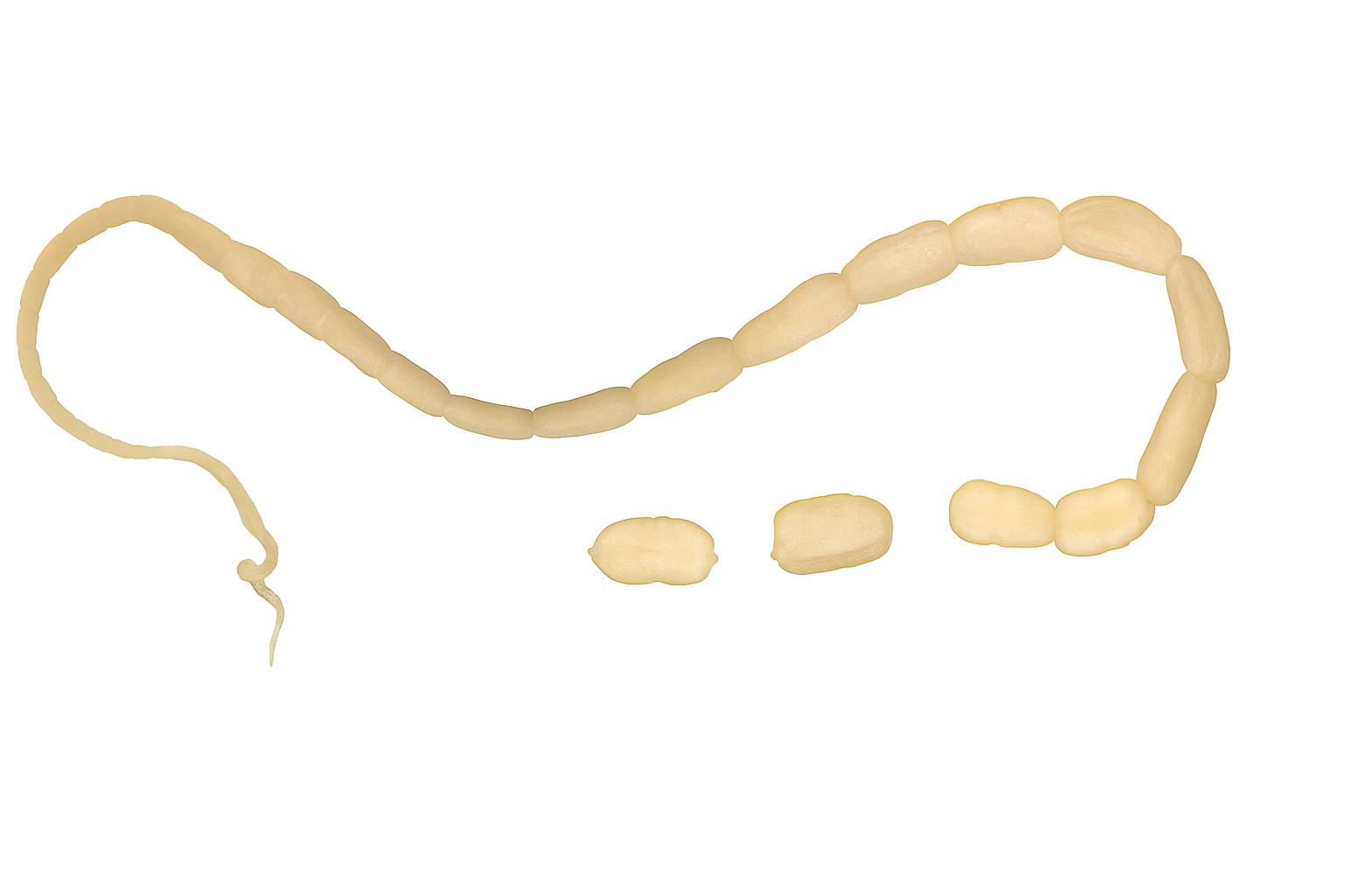 - Dipylidium caninum: es la tenia más frecuente en los gatos. Se contrae tras ingerir pulgas infectadas con larvas del parásito, que actúan como hospedadores intermediarios. Una vez en el intestino, las larvas se desarrollan hasta alcanzar la forma adulta.