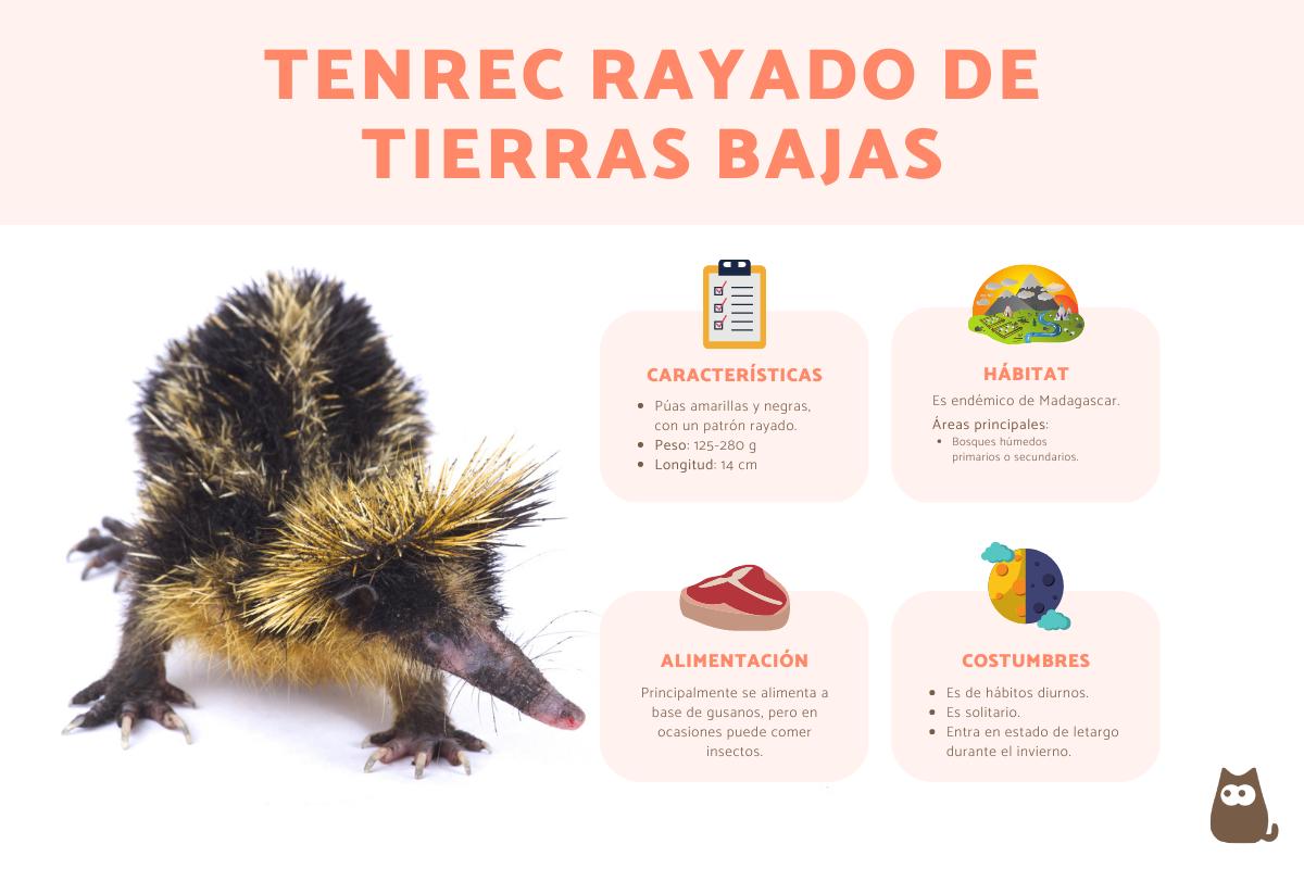 En esta ficha de ExpertoAnimal nos centraremos en una de las especies más populares, el tenrec rayado de tierras bajas (Hemicentetes semispinosus). Hablaremos de sus características, costumbres y estado de conservación, ¡sigue leyendo!