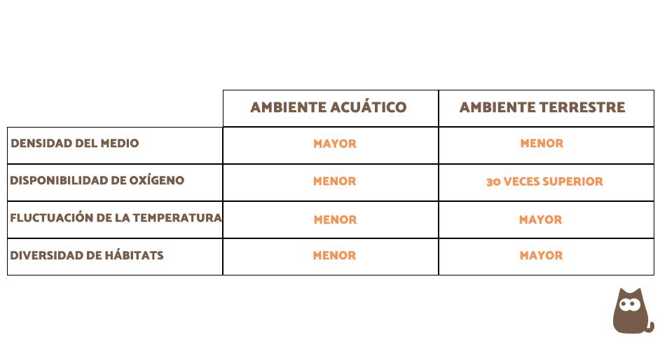 La transición del agua a la tierra es casi sin duda un ejemplo de “radiación adaptativa”. En este proceso, los animales que adquieren ciertas características (como, por ejemplo, extremidades primitivas para caminar o la capacidad de respirar aire) colonizan nuevos hábitats más propicios para sobrevivir (con nuevas fuentes de comida, menos peligro de depredadores, menos competencia con otras especies, etc.). Dichas modificaciones están relacionadas con las diferencias entre el medio acuático y el terrestre:
