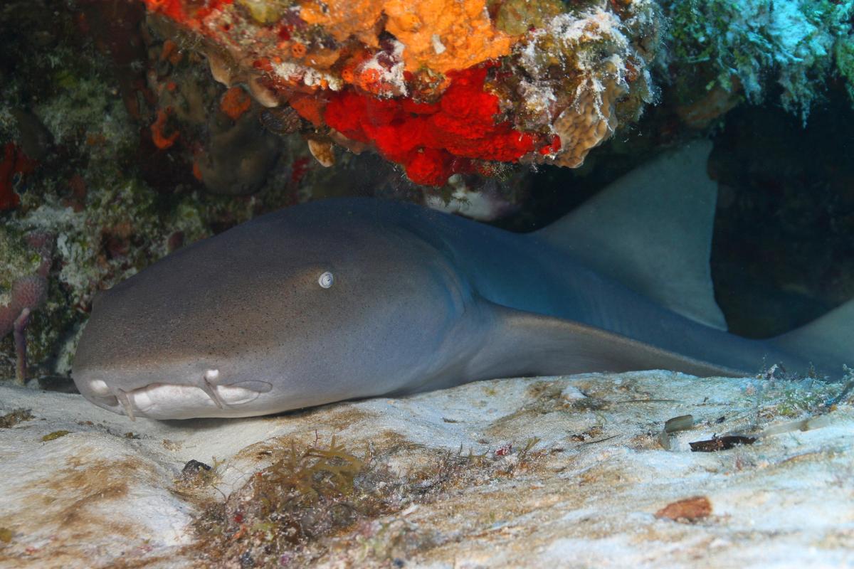 Por otro lado, para encontrar su alimento, utiliza su olfato, buscando entre grietas y espacios rocosos. A pesar de su comportamiento social, también es territorial con su alimento y no duda en morder a otro tiburón si se le acerca mientras caza.