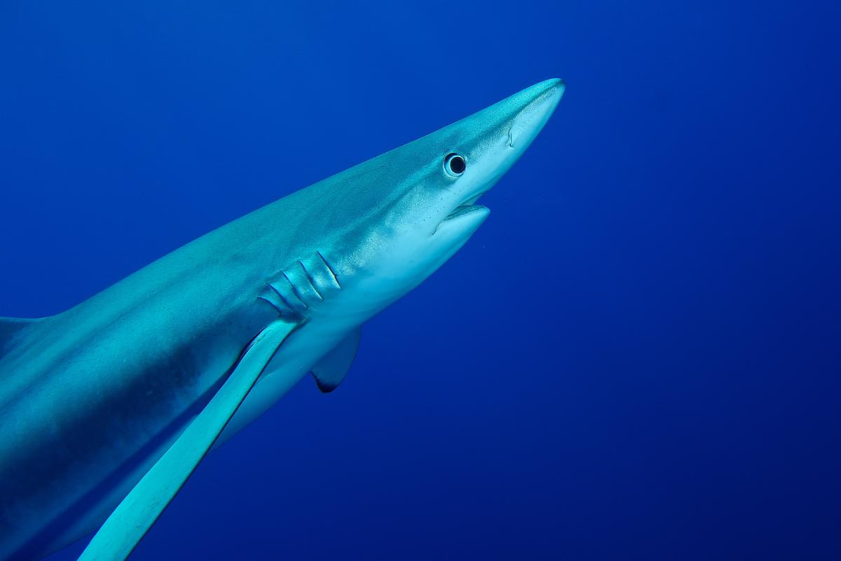 - La aleta caudal es alargada, lo que le otorga una buena velocidad. La primera aleta dorsal es el doble de grande que la segunda; mientras que las aletas pectorales son inusualmente más largas que en otras especies de tiburones.