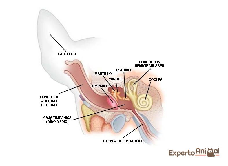 El oído del perro se divide en tres porciones: oído externo, oído medio y oído interno. El tímpano es la membrana timpánica que separa el pabellón auricular y oído externo del oído medio e interno, siendo su función la transmisión del sonido.
