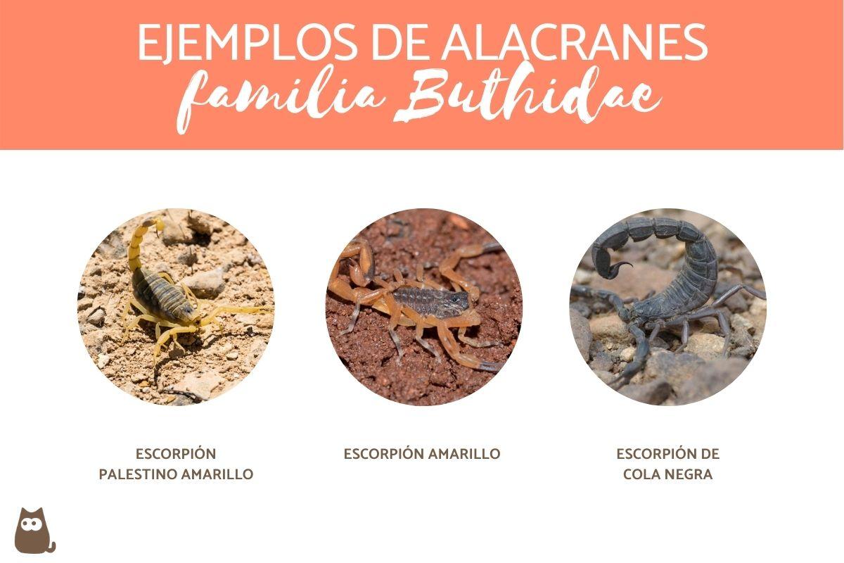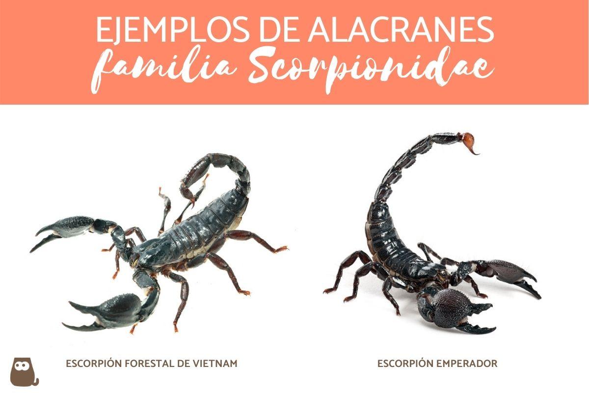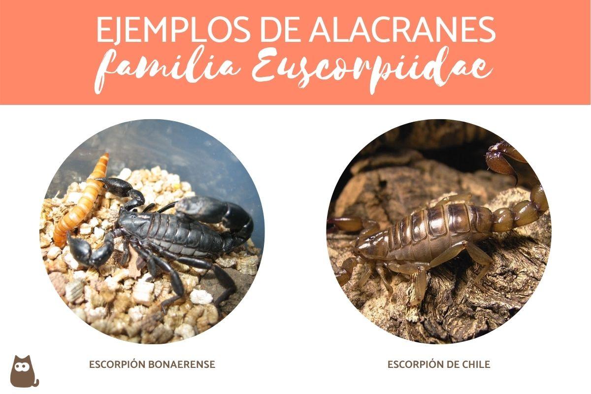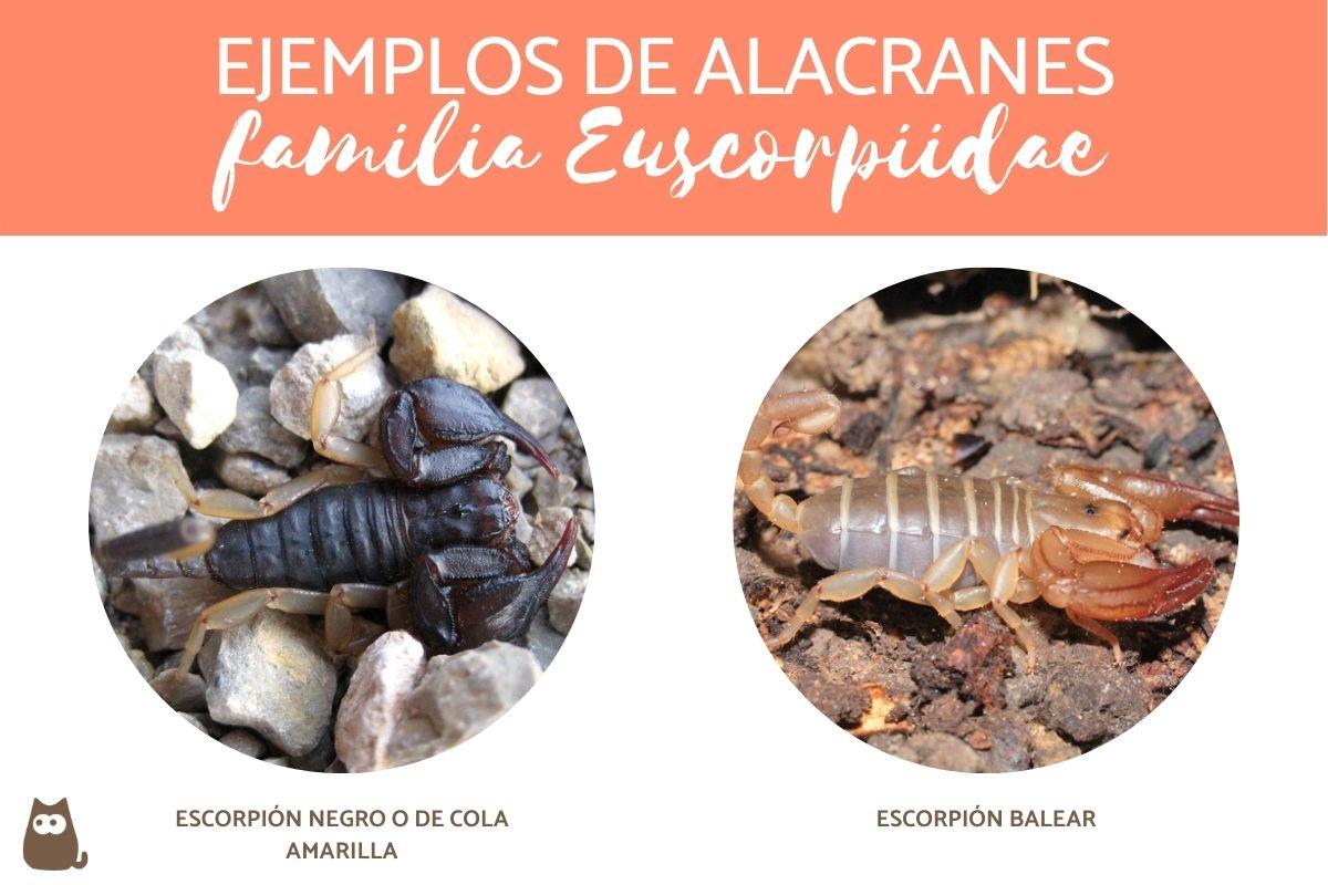 Este grupo incluye especies como el escorpión negro o de cola amarilla (Euscorpius flavicaudis), también conocido como escorpión de cola amarilla. Sin embargo, su cuerpo es prácticamente negro y puede medir hasta 5 centímetros de largo aproximadamente. Se distribuye por distintos lugares del mundo, habitando en lugares húmedos y oscuros. Al igual que la especie anterior, se trata de un escorpión poco venenoso y, por tanto, su picadura no supone gran peligro. Otra conocida especie perteneciente a este tipo de alacranes es el escorpión balear (Euscorpius balearicus), endémica de las Islas Gimnesias, pues los escorpiones de la familia Euscorpiidae se distribuyen por el sur de Europa y el continente africano.