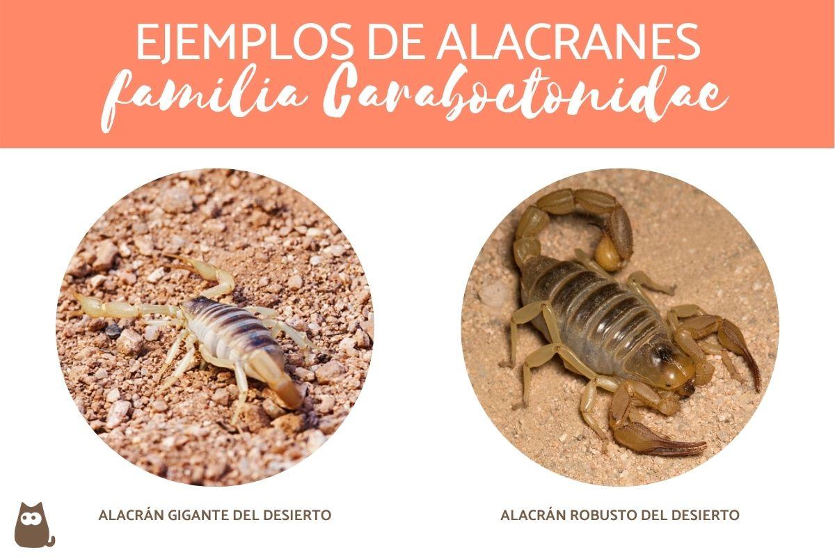 A esta familia pertenecen las especies de alacranes como Hadrurus arizonensis, también conocido como alacrán gigante del desierto, el cual se distribuye por el continente americano. Estos escorpiones adoptan colores más tenues como el gris o el amarillo y pueden medir más de 10 centímetros. No obstante, el dimorfismo sexual es muy marcado, ya que los machos suelen tener cuerpos más alargados y las hembras algo más anchos. Hadrurus hirsutus, conocido como alacrán robusto del desierto, es otra especie perteneciente a la familia Caraboctonidae y, al igual que H. arizonensis y otros muchos escorpiones del grupo, se encuentra en diferentes estados de América como México y California. Así pues, este es uno de los tipos de alacranes en México más habituales.