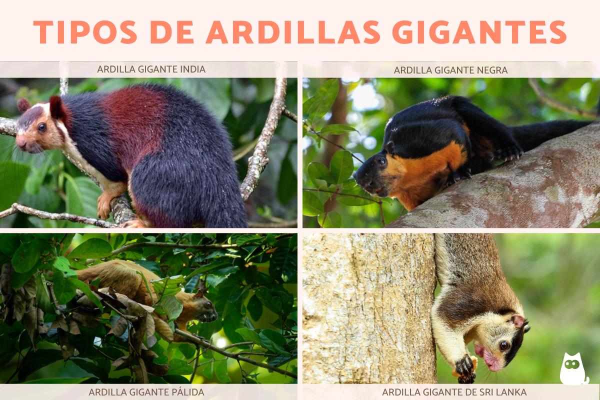 Las ardillas gigantes, como su nombre lo indica, destacan por sus grades tamaños en comparación a otros tipos, ya que pueden llegar a medir alrededor de 50 cm. Son propias de Asia, habitando en bosques densos, tanto tropicales como subtropicales. Sus colores de pelaje pueden ser combinaciones de negro, blanco y rojo. Al igual que otras especies de ardillas arbóreas, destacan por su agilidad como trepadoras, debido a que son de hábitos arbóreos.