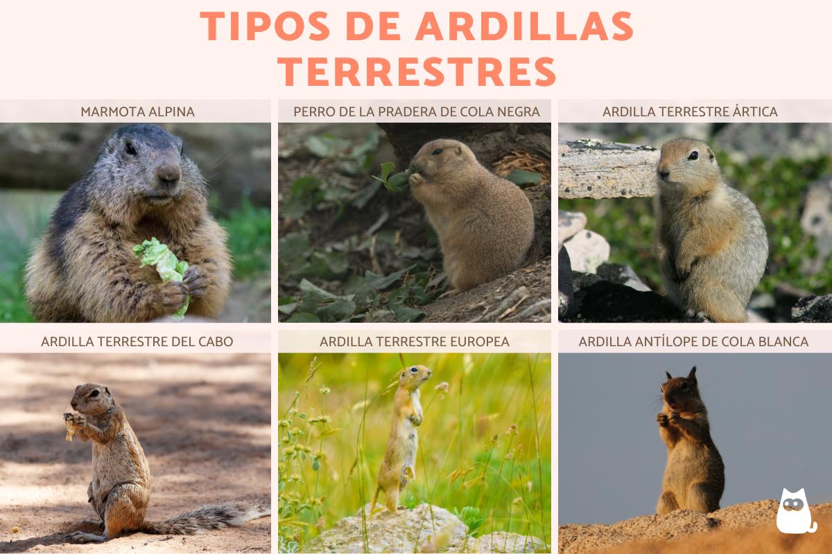 Dentro de este tipo de ardillas encontramos a las ardillas holárticas, las cuales a su vez contienen a los conocidos como perros de las praderas, marmotas, ardillas listadas, entre otras; y otro variado grupo llamado ardillas terrestres africanas, el cual también cuentan con una gran variedad de tipos.
