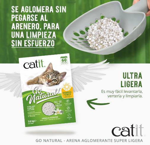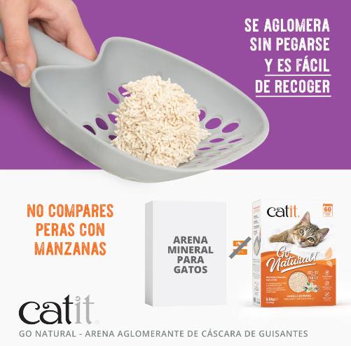 Un ejemplo que recomendamos de este tipo de arena vegetal para gatos es la arena de cáscara de guisante Go Natural de Catit, no solo por su capacidad aglomerante y absorbente (hasta tres veces su peso), superior a la de otras arenas, sino también porque: