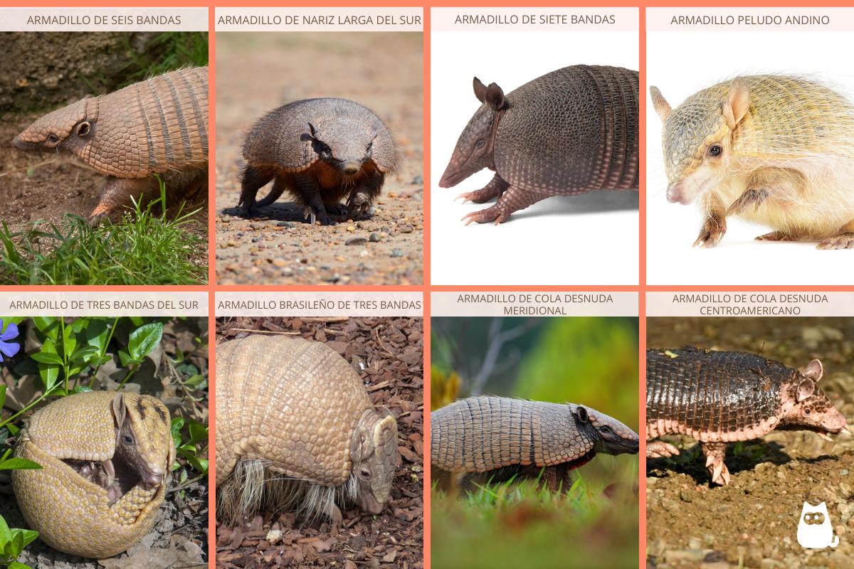 Como hemos comentado al inicio, existen alrededor de 20 especies de armadillos. Por ello, a continuación, presentamos el resto de especies de armadillos hasta ahora identificadas: