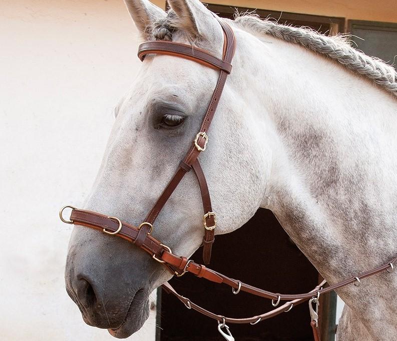 - Cabezada de dar cuerda: este tipo de cabezadas están diseñadas para las sesiones de cuerda con el caballo, es decir, para ejercitar y dirigir al caballo desde el suelo. Esta clase de cabezada puede o no tener bocado, además de poseer distintos aros por dentro de los cuales pasará la cuerda para poder controlar la postura del animal durante el ejercicio.
