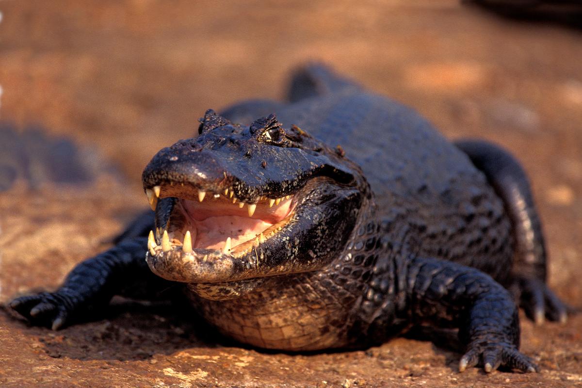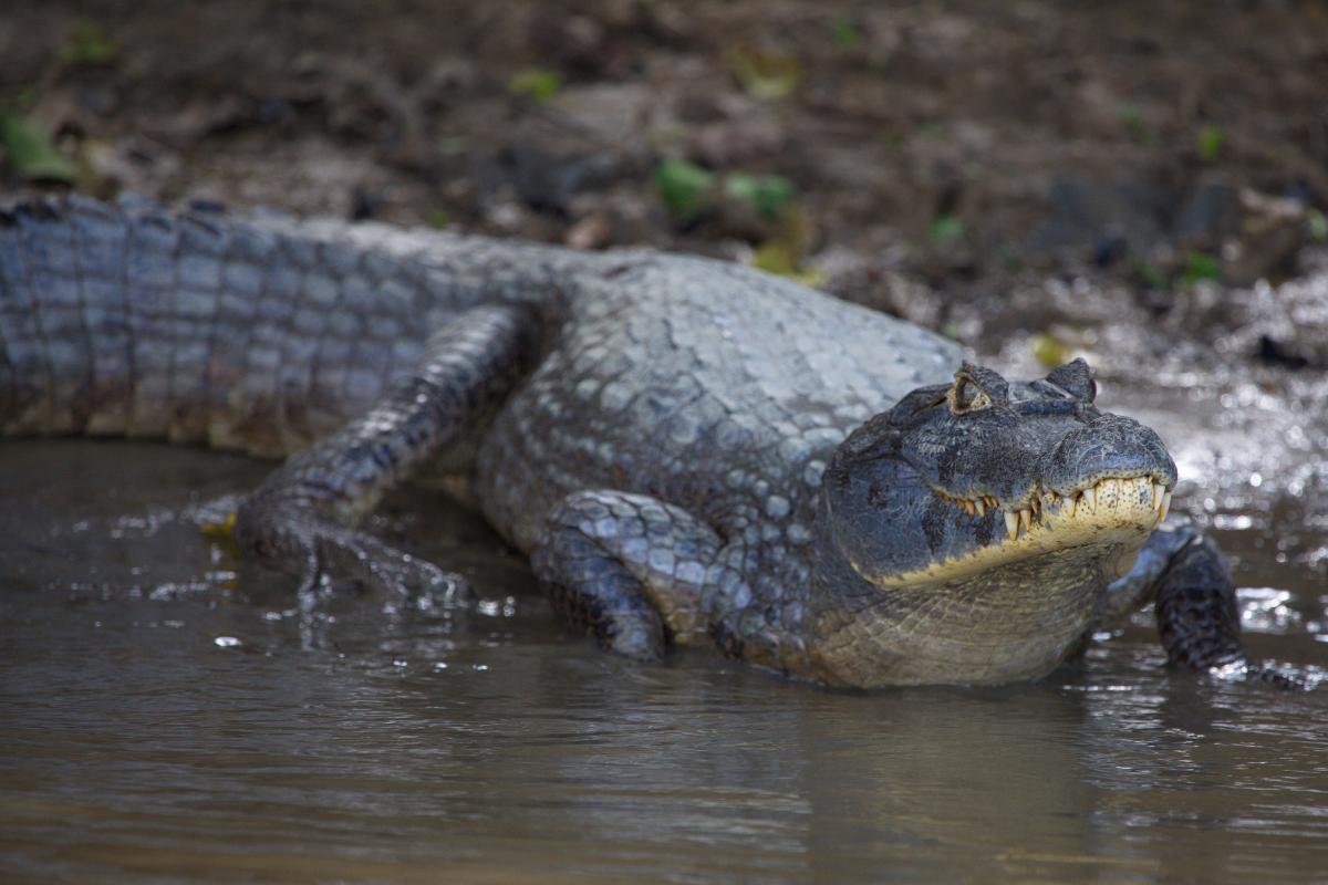 El caimán yacaré habita principalmente en el Pantanal brasileño, así como en ríos y humedales de Bolivia, Paraguay y el noreste de Argentina. Este reptil puede alcanzar los 3 metros de largo y se reconoce fácilmente porque algunos de sus dientes, especialmente los del maxilar inferior, permanecen visibles incluso cuando la boca está cerrada.