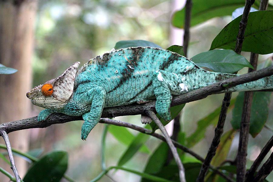 - El camaleón Pantera es de las especies favoritas para mantener en cautiverio. Originaria de Madagascar, específicamente del Noreste, Este y Norte del país. Tienen un buen tamaño, sin llegar a ser gigantes. Son muy resistentes y tienen gran adaptabilidad. Pueden llegar a alcanzar los 55 cm, sin embargo es común que solamente lleguen a 45 cm.