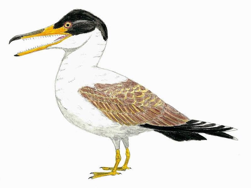 Fue una de las primeras aves con dientes en descubrirse y Charles Darwin la consideró como una de las mejores pruebas de la teoría de la evolución. Estos dinosaurios voladores vivieron hace 90 millones de años y medían unos 43 centímetros de envergadura alar. Externamente, eran muy parecidas a las gaviotas actuales.