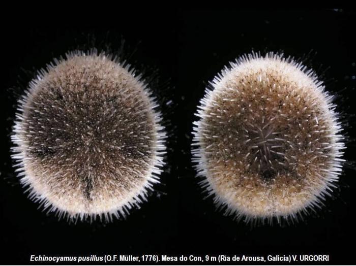 También conocido como erizo de mar de orilla, esta especie se distribuye en el Océano Atlántico, siendo muy común en el Mar del Norte. Generalmente esta especie habita hasta los 100 metros de profundidad, en zonas rocosas y con abundancia de algas. De hecho, es muy común encontrarla asociada a algas marrones. También es muy común en zonas de praderas marinas y bancos de ostras. Mide cerca de 6 cm de diámetro y el color de su caparazón es pardo grisáceo, mientras que sus espinas son verdes con las puntas violetas.