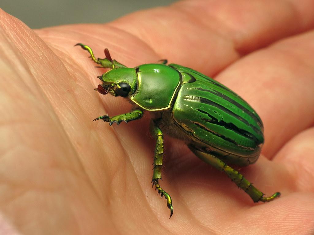 Otros de las clases de escarabajos grandes es el mayate (Cotinis mutabilis). Esta especie puede encontrarse en México y Estados Unidos. Destaca por su coloración, pues el cuerpo muestra un tono verde brillante muy llamativo. El mayate es un escarabajo que se alimenta de estiércol. Además, es otro de los tipos de escarabajos voladores.