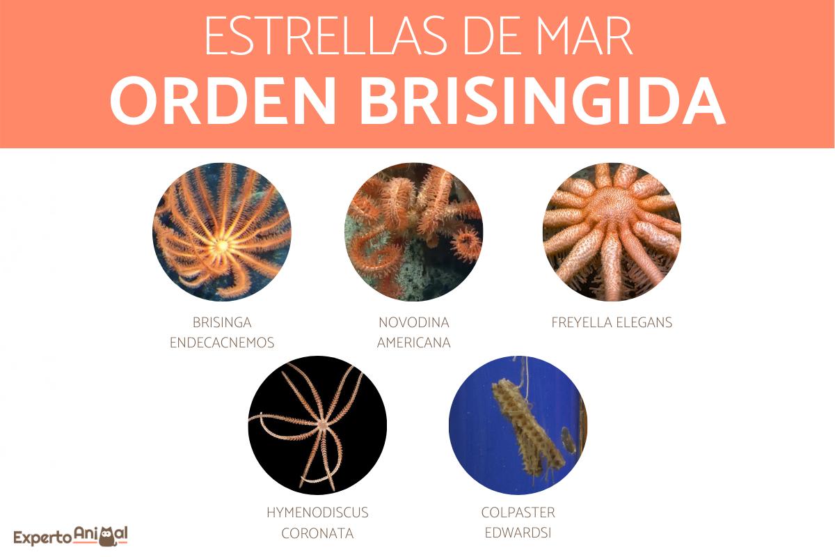 El orden Brisingida está formado por dos familias, Brisingidae y Freyellidae, con un total de 16 géneros y más de 100 especies. Algunas de estas son: