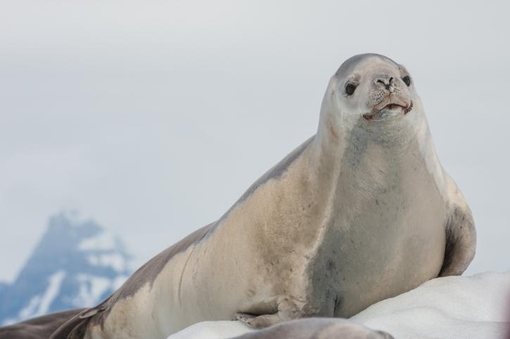 La foca leopardo se encuentra en la Antártida y también está asociada a las plataformas de hielo oceánico. Es de gran tamaño, tanto las hembras como los machos pueden alcanzar más de tres metros de longitud y su pelaje es de color gris, volviéndose más claro en la parte ventral, con manchas en el cuello y pecho, lo que le da su nombre. Su aspecto es musculoso y su cabeza recuerda a la de una gran serpiente, con una boca muy grande que deja ver sus largos dientes afilados.