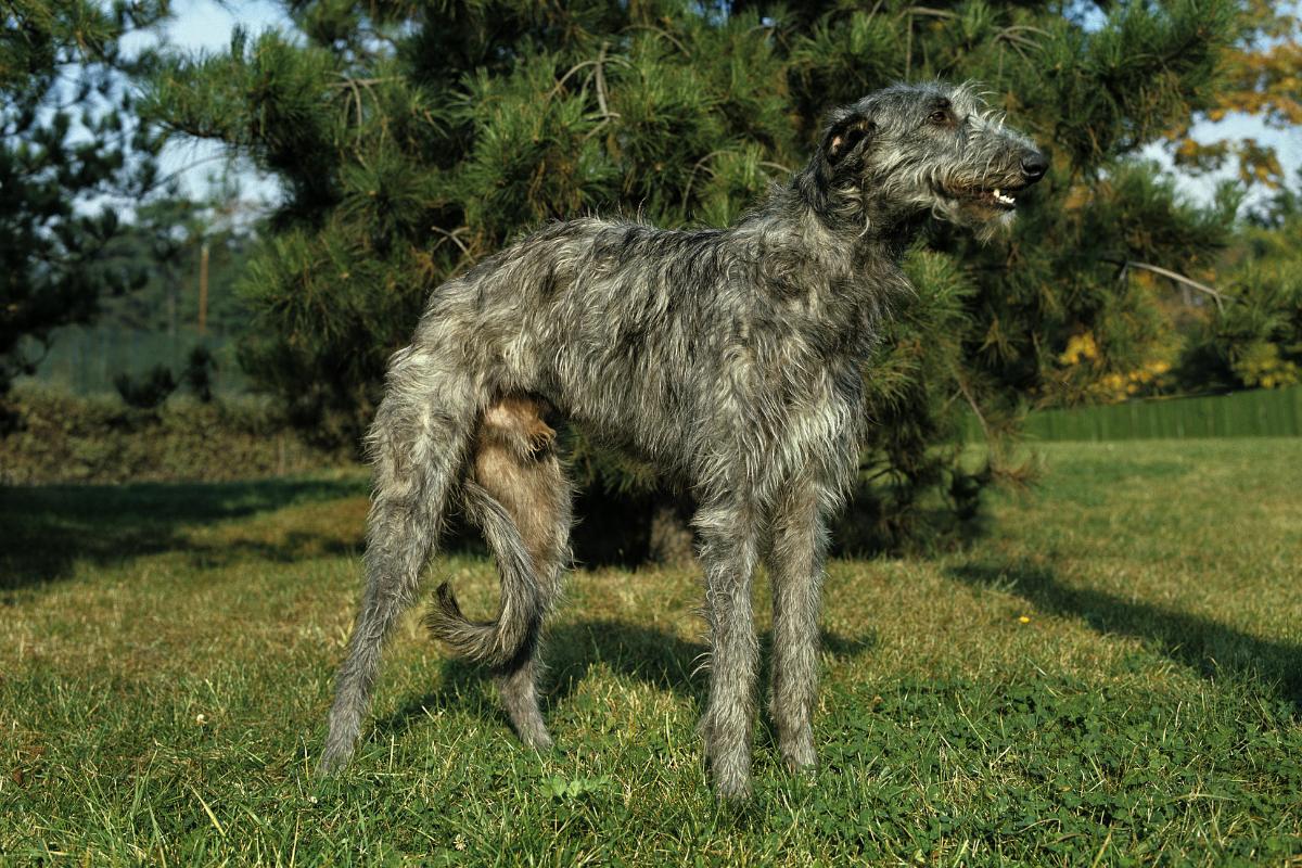 El wolfhound es originario de Irlanda y es considerado como un descendiente del galgo escocés, además se encuentra entre los perros más grandes del mundo. Se trata de un can gigante, con pecho profundo, cuello largo y musculatura bien desarrollada. Su hocico puntiagudo es muy parecido al deerhound, así como el pelaje largo y espeso con una textura dura al tacto.