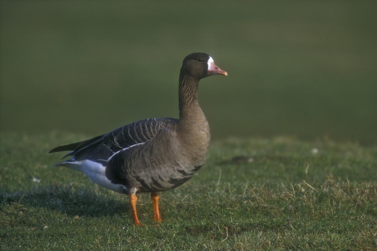 Anser albifrons, es una especie de ganso migratorio que habita en el hemisferio norte. Se distingue por su frente blanca, patas naranjas y un cuerpo gris parduzco con manchas oscuras en el vientre.