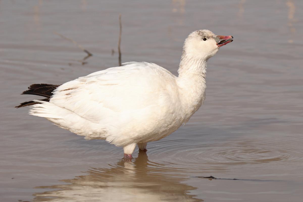 Chen rossi es una especie de ganso migratorio de tamaño pequeño, originario de América del Norte. Se caracteriza por su plumaje blanco con un ligero tono grisáceo en las alas y un pico negro con una pequeña mancha de color rosado en la base