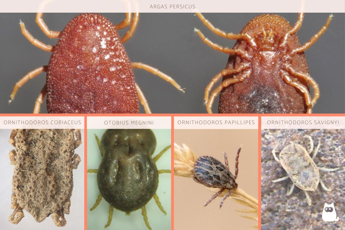 - Garrapatas de las aves (Argas persicus): parasita principalmente a las aves y en menor medida a humanos.