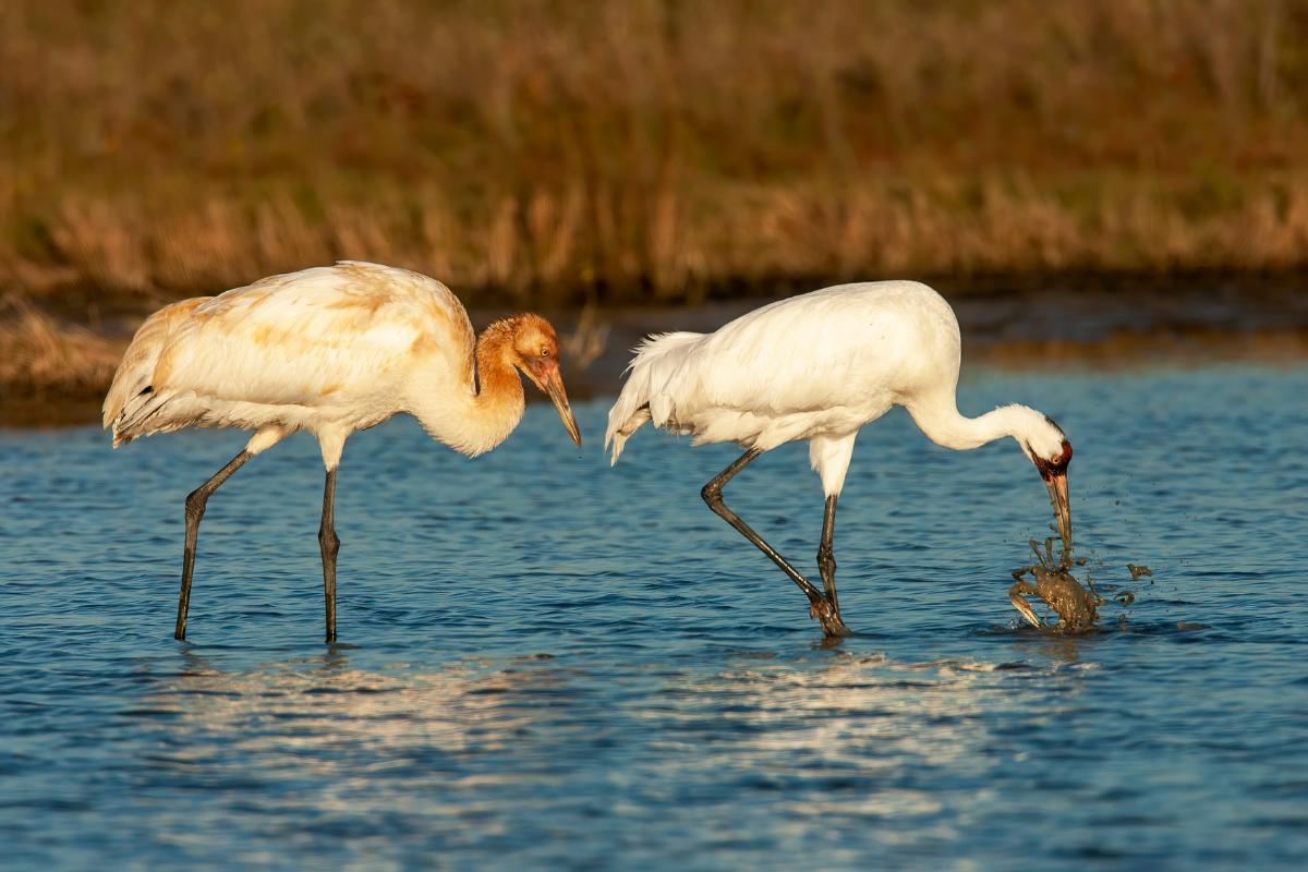La grulla trompetera, también conocida como “whooping crane”, es una de las más raras y emblemáticas del mundo. Mide hasta 1,5 metros y tiene un plumaje blanco puro con puntas negras en las alas. Presenta una corona roja y un pico largo y oscuro.