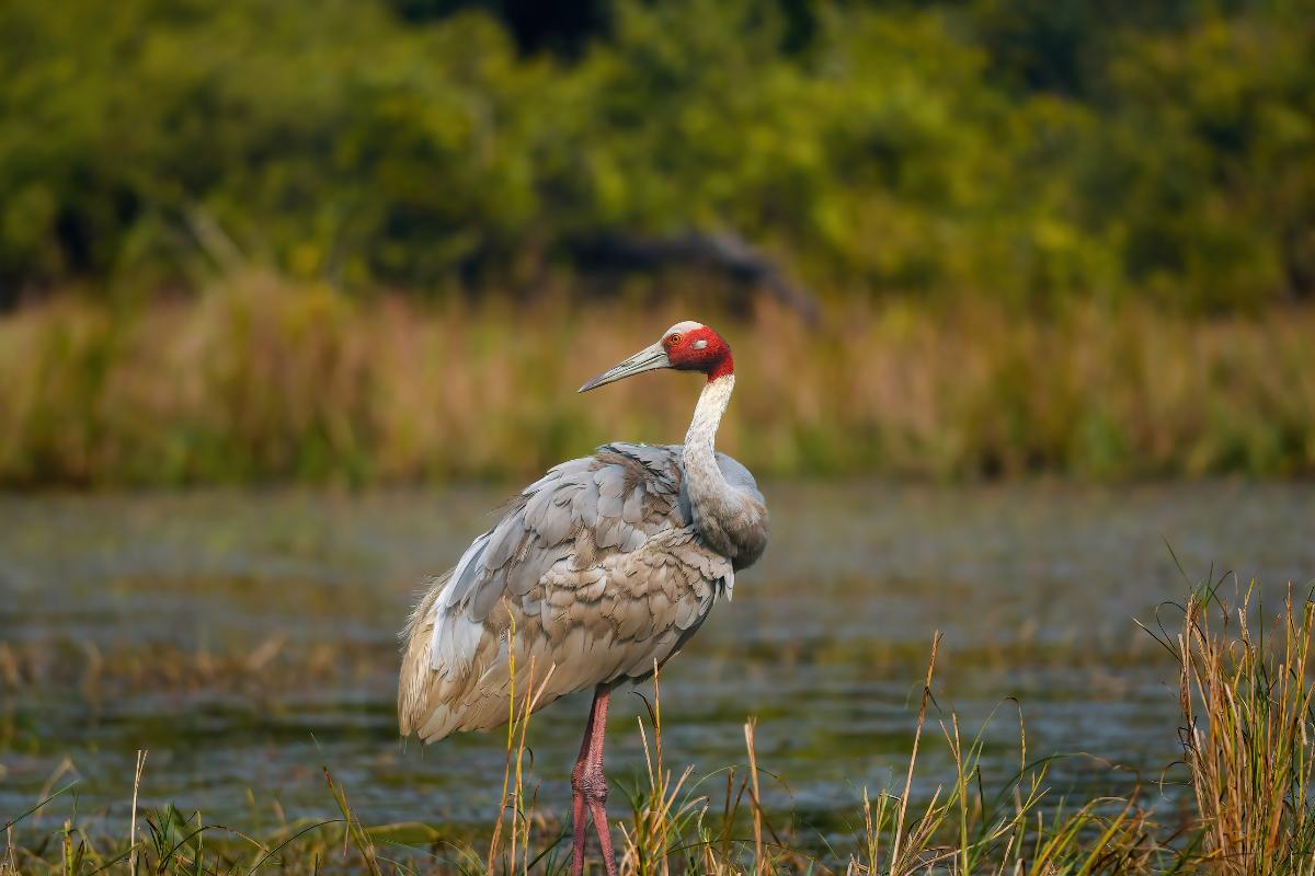 La grulla sarus es la más alta de todas las especies de grullas, ya que llega a medir 1,8 metros de altura. Tiene el plumaje gris y la cabeza roja desnuda que la distingue fácilmente de otros tipos.