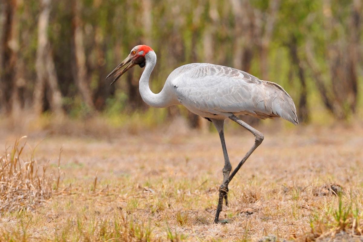 Este tipo de grulla es endémico de Australia y Nueva Guinea. Mide hasta 1,3 metros, presenta plumaje gris y una zona desnuda roja en la cabeza y cuello superior.
