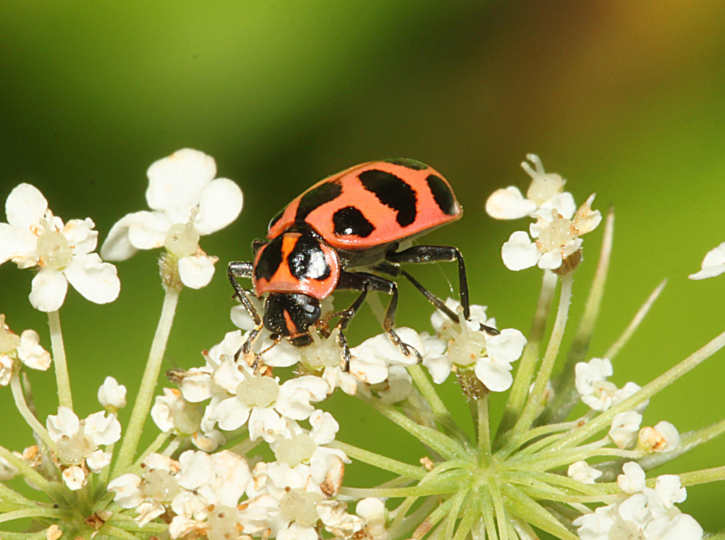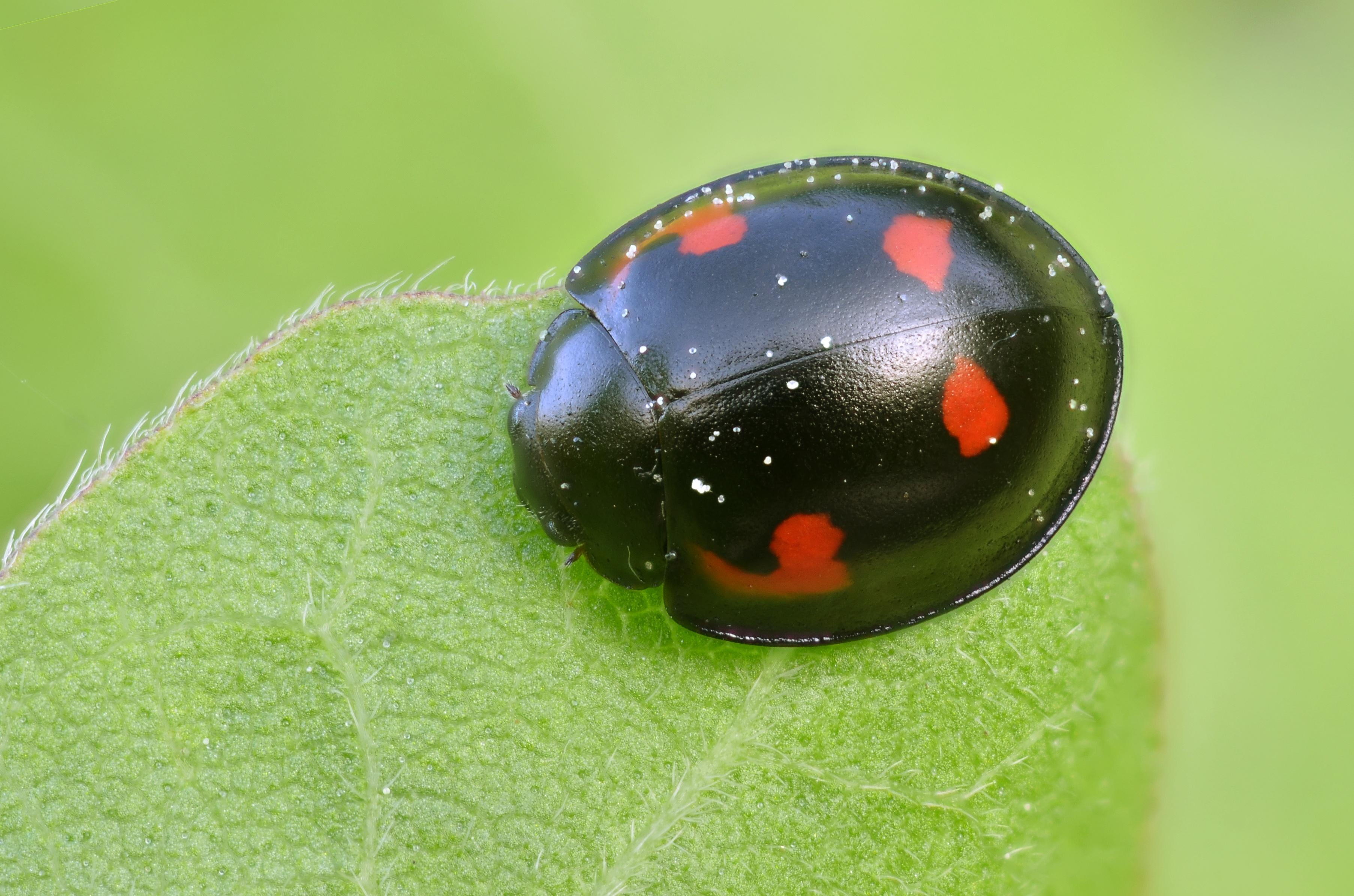 Esta mariquita destaca en Europa occidental y se caracteriza por presentar solamente dos puntos negros en su rojo cuerpo. Cabe destacar que existen algunos ejemplares negros con cuatro puntos rojos, aunque son muy difíciles de avistar en la naturaleza. Al igual que otras muchas especies de mariquitas, la de dos puntos se utiliza en muchos lugares para controlar las plagas de pulgones.