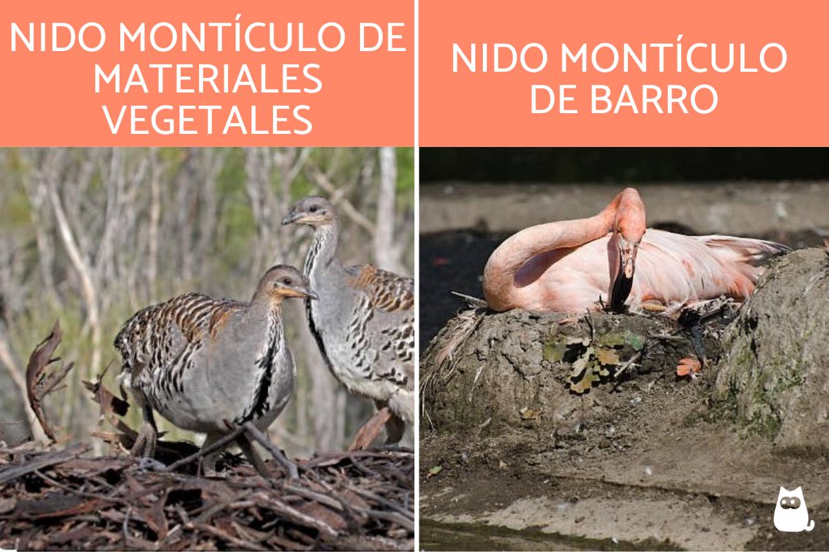 En la imagen vemos un nido de mallwwfowl y un nido de flamenco para observar las similitudes y diferencias entre ellos.