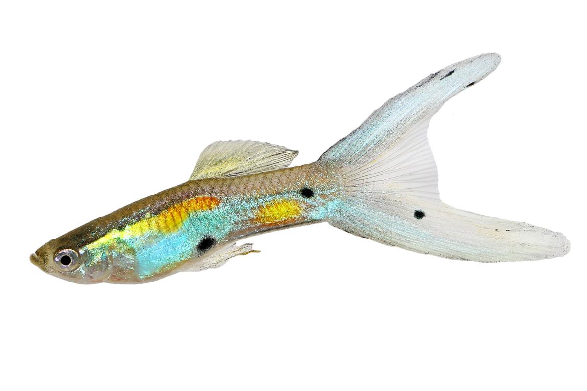 Esta variedad de guppy es peculiar, ya que se caracteriza por tener la zona final de su aleta caudal fina y alargada, similar a una aguja. Tiene un aspecto elegante y estilizado, y suele ser de menor tamaño que otros tipos. Su coloración es generalmente monocromática, en tonos como negro, blanco o azul. Otra de sus características es que puede nadar más rápido que otros guppys con colas más desarrolladas, lo que le facilita la movilidad.
