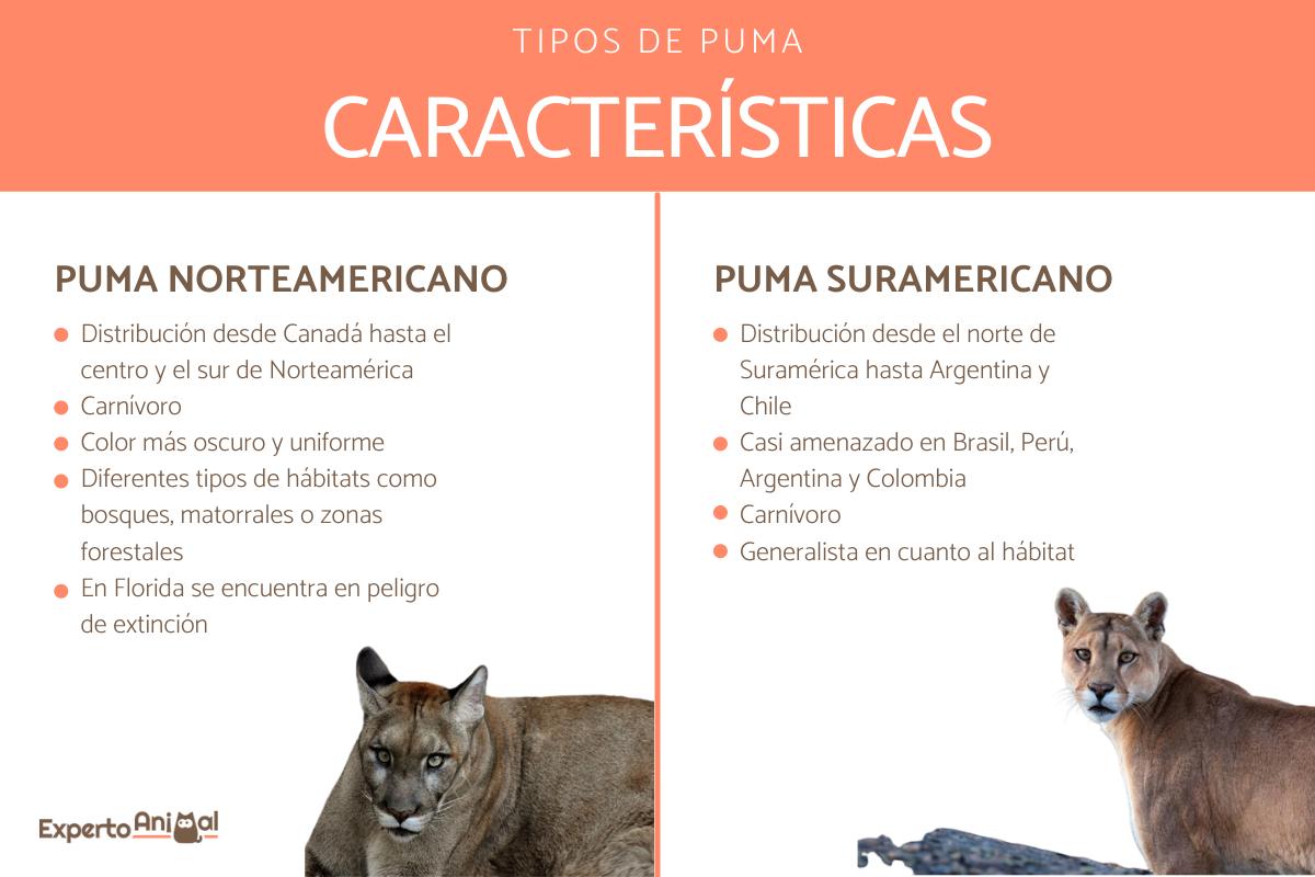 En base al estudio mencionado anteriormente, por parte de expertos de la UICN actualmente se reconocen dos tipos de puma: el norteamericano (Puma concolor couguar) y el suramericano (Puma concolor concolor). A continuación, vamos a conocer algunos aspectos de cada uno de ellos.