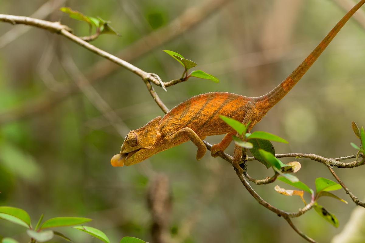 Sus ojos móviles independientes proporcionan visión 360°, y su lengua balística se proyecta a 6 m/s para capturar insectos. Estrictamente arbóreo, vive en los bosques húmedos del este de Madagascar. Su población se encuentra amenazada debido a la deforestación y el comercio ilegal, ya que es una especie solicitada como mascota exótica.