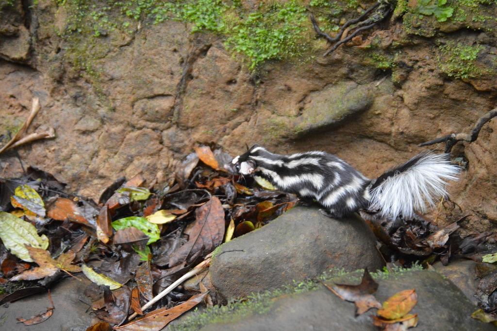 Esta especie de zorrillo se identifica como Conepatus semistriatus y nativa de Belice, Brasil, Colombia, Costa Rica, Ecuador, Honduras, México, Nicaragua, Panamá, Perú y Venezuela. Vive en pastizales, bosques abiertos, bosques caducifolios y zonas medianamente intervenidas. Su promedio de peso es de 1,6 kg, mientras que su longitud es de 57 cm. Tiene el típico color negro, con una franja que sale de la nuca y se ramifica en dos hacia atrás, al inicio de la cola, la cual se vuelve primero negra y luego blanca. También es nocturno y omnívoro, pero consume principalmente insectos, aves y lagartos. Se incluye en la categoría de "menor preocupación".