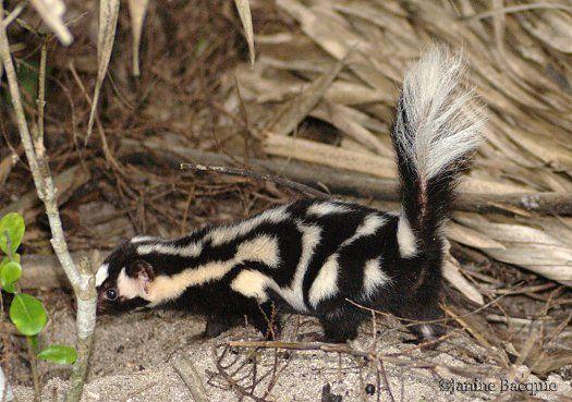 Vive en matorrales, bosques abiertos y espacios agrícolas. Mide unos 34 cm, con la cola de 23 cm aproximadamente, y pesa entre 0,5 y 1 kg. El color de base es negro, con varias franjas blancas en el dorso, mientras que la parte inferior es negra. Aunque es terrestre, trepa muy bien, es omnívora y tiene hábitos nocturnos. Se clasifica como de "menor preocupación".