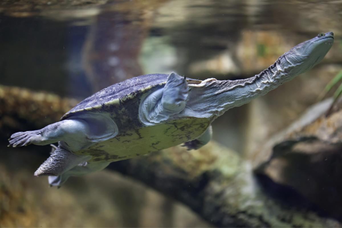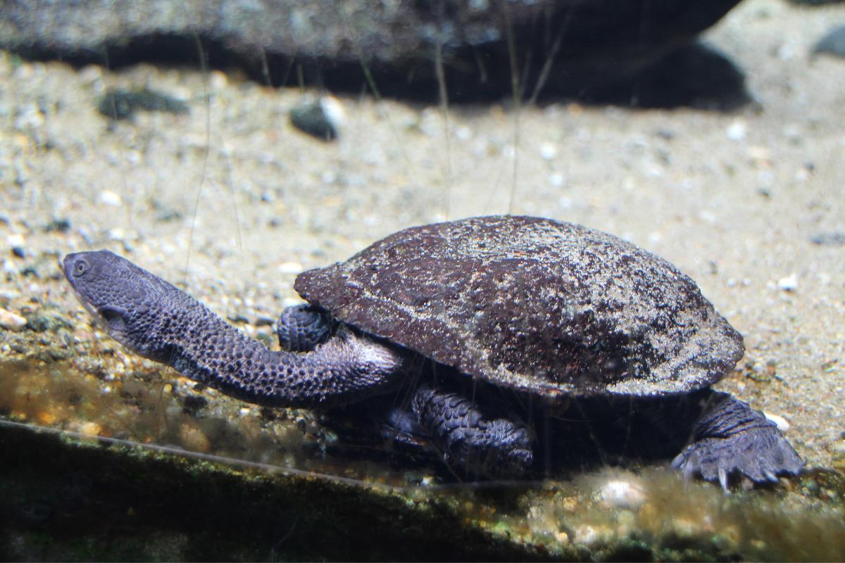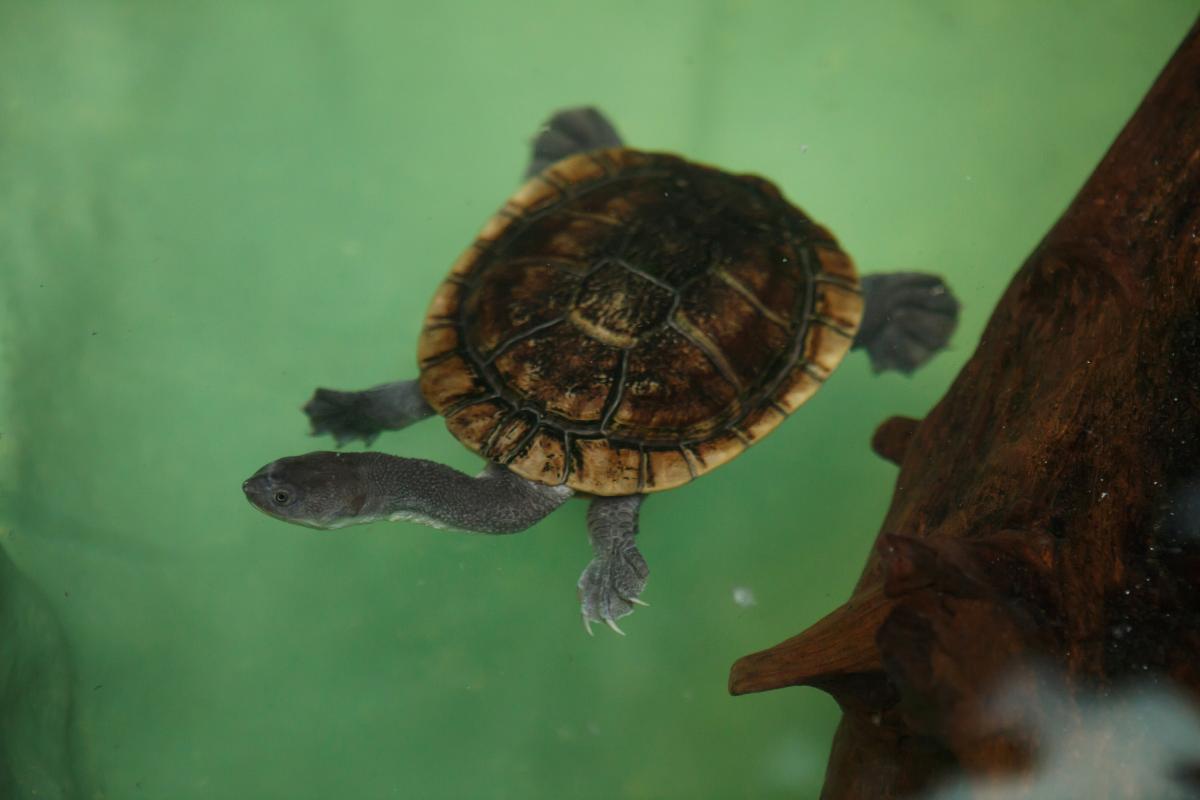 La tortuga cuello de serpiente es una especie única y fácilmente identificable debido a sus características físicas distintivas. Su rasgo más sobresaliente es su cuello largo y delgado, que le permite estirarlo hacia adelante para alcanzar la superficie del agua desde el fondo de su cuerpo mientras permanece sumergida. Esta adaptación única facilita su respiración y la captura de presas sin tener que emerger completamente.